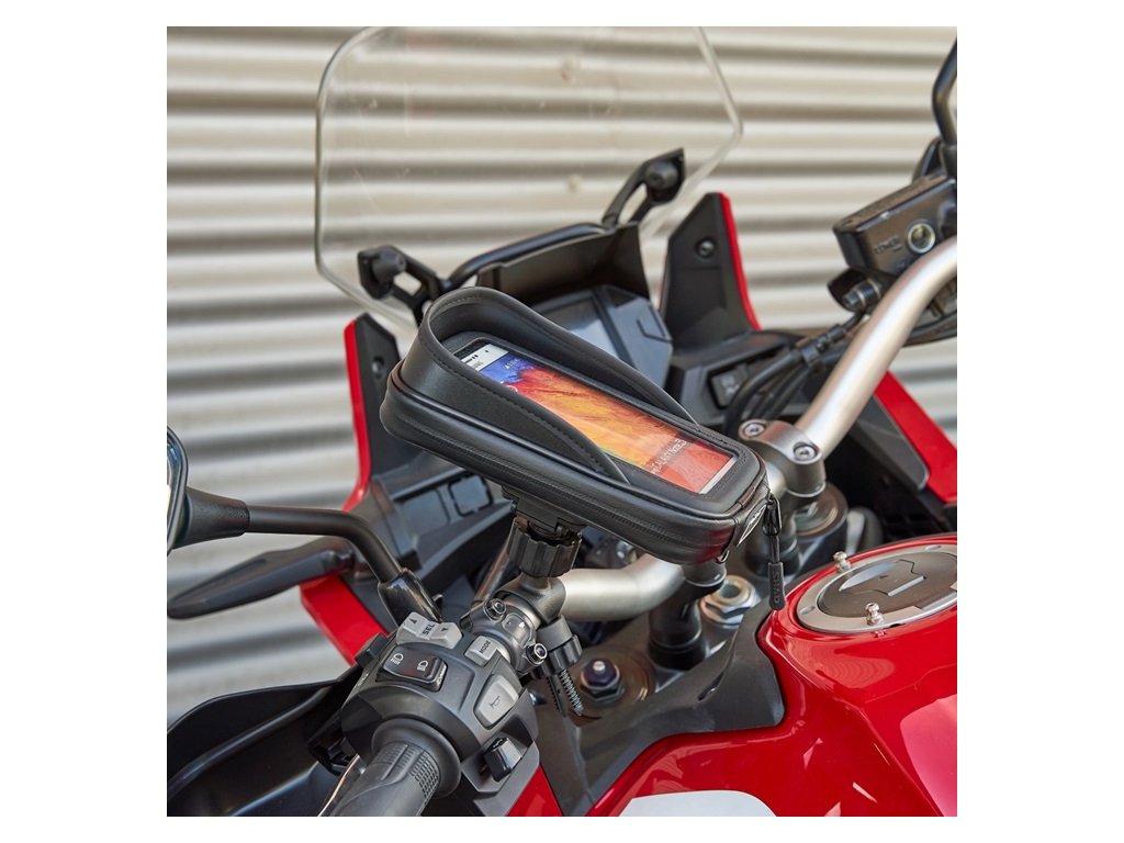 Držiak smartfónu kompatibilný so všetkými motocyklami. Rýchla a jednoduchá inštalácia na riadidlá vďaka univerzálnemu montážnemu systému, nastaviteľnému aj v rukaviciach. Antireflexný priezor, zosilnený vývod kábla a vnútorné podložky pre rôzne veľkosti telefónov. Bezpečnostný popruh súčasťou. Kompatibilné aj s inými vozidlami, ako sú štvorkolky, bicykle alebo skútre.Dodatočné parametre