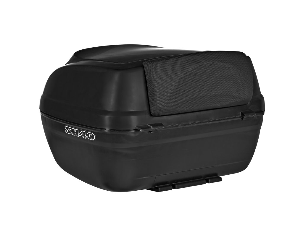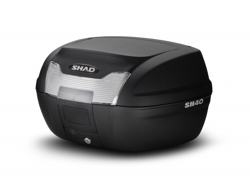 Vrchný kufor SH40 s kapacitou pre jednu integrálnu helmu alebo dve helmy: integrálnu a otvorenú. SH40 je vrchný kufor vyrobený z vysoko kvalitného tvrdeného polypropylénu. Tento kufor je schopný odolať extrémnym teplotám, snehu aj dažďu a zároveň chráni obsah pred nárazmi a poškodením. Objem 40 litrov zaručuje dostatok miesta pre integrálnu helmu a rukavice alebo 2 otvorené helmy. Zabezpečenie systémom Handle Lock ponúka dvojitý zámok, ktorý jednak pripevňuje kufor k motocyklu a zároveň uzamyká vrchný kufor. Kufor má tiež rukoväť pre ľahké prenášanie pokiaľ ho zložíme z motorky. Súčasťou kufra sú popruhy ktoré zaisťujú, že sa obsah vo vnútri nepohybuje. Rovnako ako všetky vrchné kufre SHAD, je možné aj tento kufor otvoriť a zavrieť iba jednou rukou, na otvorenie alebo zatvorenie nie je potrebný kľúč. Kľúč je nutný iba v prípade, že chceme kufor zamknúť. Pokiaľ kladiete dôraz na dizajn, určite oceníte možnosť výberu z rôznych farebných variantov krytu kufra. Je možné tiež zvoliť variant bez laku, kedy si farbu môžete sami prispôsobiť podľa vlastného vkusu. Ako voliteľné príslušenstvo je možné ku kufru dokúpiť opierku a brzdové svetlo. Opierka (D0RI60) zaručuje väčšie pohodlie pre spolujazdcov. Brzdové svetlo (D0B40KL) je úsporné LED svetlo, ktorého montáž je veľmi jednoduchá. Toto svetlo zvyšuje bezpečnosť prevádzky, pretože motorka sa s týmto svetlom stáva oveľa viditeľnejšou zozadu. Rovnako ako všetky vrchné kufre SHAD (okrem TR48/TR37) je aj kufor SH40 dodávaný s platňou a sadou montážnych skrutiek.Dodatočné parametre