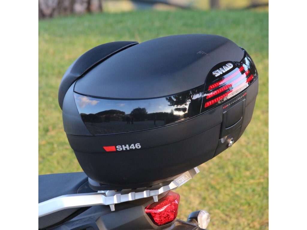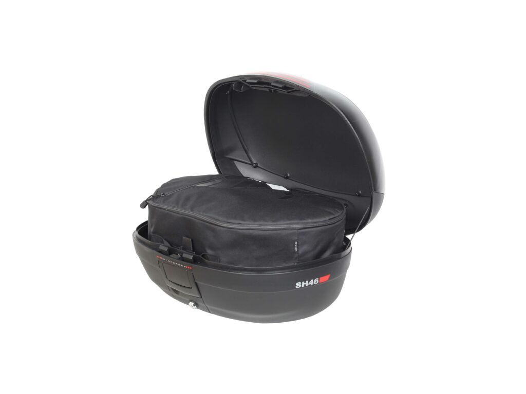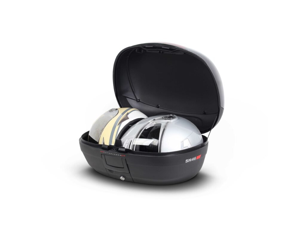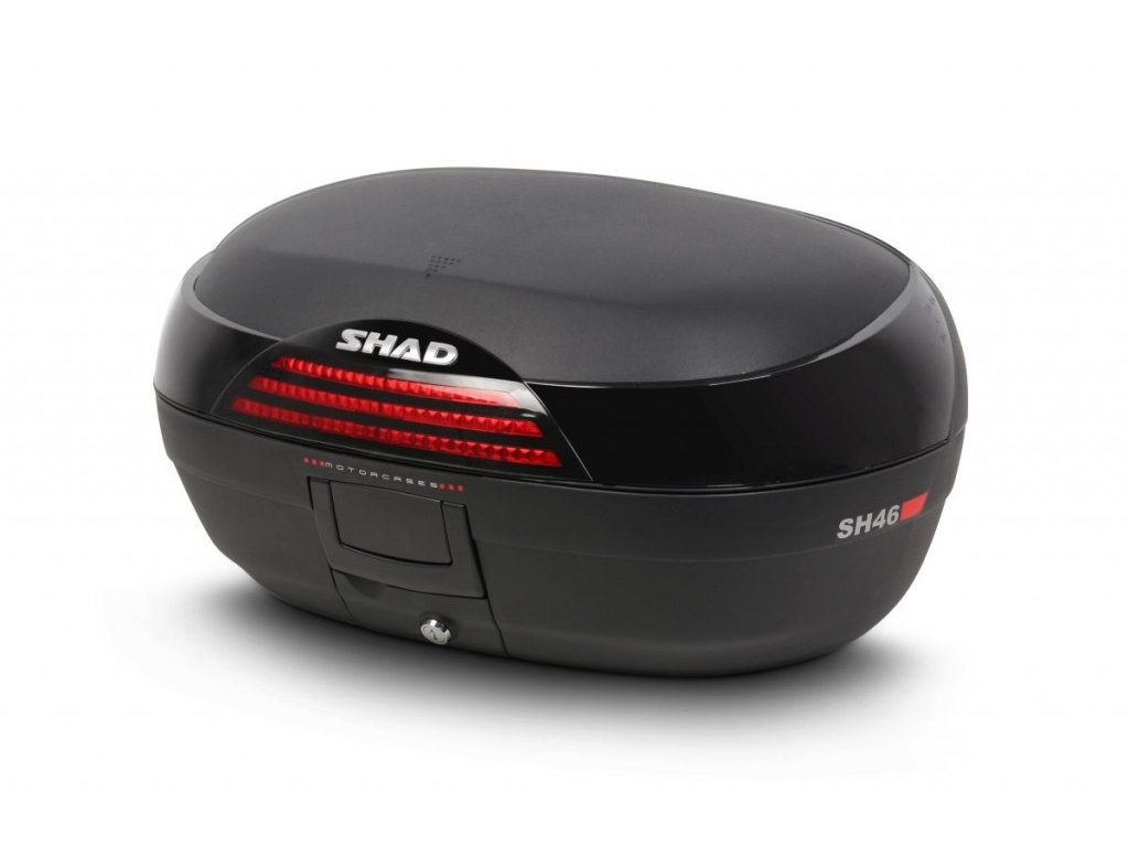 Vrchný kufor SH46 s kapacitou pre 2 helmy Vrchný kufor SH46 je robustný vrchný kufor vyrobený z vysoko kvalitného tvrdeného polypropylénu. Tento kufor je schopný odolať extrémnym teplotám, snehu aj dažďu a zároveň chráni obsah pred nárazmi a poškodením. Má objem vhodný pre 2 integrálne helmy plus ďalšie cestovné vybavenie. Má zaoblené tvary a 3 rady červených odraziek na čiernom pozadí. Má ideálnu veľkosť pre jazdu po meste ale aj na dlhšie výlety a je preto vhodný ako na skútre tak na stredné aj väčšie motorky. Zabezpečenie systémom Handle Lock ponúka dvojitý zámok, ktorý jednak pripevňuje kufor k motocyklu a zároveň uzamyká vrchný kufor. Kufor má tiež rukoväť pre ľahké prenášanie pokiaľ ho zložíme z motorky. Súčasťou kufra sú popruhy ktoré zaisťujú, že sa obsah vo vnútri nepohybuje. Rovnako ako všetky vrchné kufre SHAD, je možné aj tento otvoriť a zavrieť iba jednou rukou, na otvorenie alebo zatvorenie nie je potrebný kľúč. Kľúč je nutný iba v prípade, že chceme kufor zamknúť. Ako voliteľné príslušenstvo je možné dokúpiť opierku, vnútornú tašku, vrchný nosič a brzdové svetlo. Opierka (D0RI50) zaručuje väčšie pohodlie pre spolujazdcov. Vnútorná taška (X0IB00) s vrchným otváraním a vonkajším vreckom je perfektný doplnok, keď je potrebné previezť náklad bezpečne a pohodlne. Vyrobená z vysoko kvalitných materiálov. Vrchný nosič (D0PS00) zvyšuje kapacitu kufra pri zachovaní rovnakého maximálneho zaťaženia. Má tiež špecifické úchyty pre popruhy na zaistenie a držanie nákladu. Brzdové svetlo (D0B40KL) je úsporné LED svetlo, ktorého montáž je veľmi jednoduchá. Toto svetlo zvyšuje bezpečnosť prevádzky, pretože motorka sa s týmto svetlom stáva oveľa viditeľnejšou zozadu. Rovnako ako všetky vrchné kufre SHAD (okrem TR48/TR37) je aj kufor SH46 dodávaný s platňou a sadou montážnych skrutiek.Dodatočné parametre