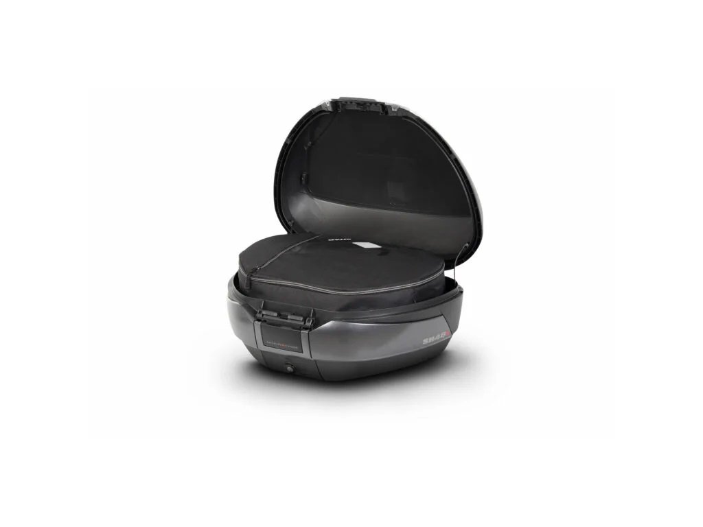 Vrchný kufor SH48 s kapacitou pre 2 helmy Vrchný kufor SH48 je špičkový produkt, ktorý spĺňa všetky požiadavky trhu a ponúka maximálne využitie. Tento kufor má kapacitu pojať 2 XXL helmy, ale zároveň jeho hmotnosť je iba 3,7 kg, čím sa stáva najľahším veľkokapacitným vrchným kufrom na trhu. Konštrukcia tohto kufra zaručuje vysokú tuhosť a odolnosť pri zachovaní minimálnej hmotnosti, čím okrem iného dochádza k redukcii vibrácií podvozku motorky a vy si môžete vychutnávať pohodlnú jazdu. Kufor SH48 ponúka maximálne zabezpečenie vďaka inovatívnemu hermetickému zámku „Smart Lock System“, s automatickou sklopnou rukoväťou a hermetickým zámkom s tromi polohami. Tento systém umožňuje otvoriť a zatvoriť kufor iba jednou rukou bez kľúča. Kľúč použijeme iba ak chceme kufor zamknúť alebo odomknúť alebo sňať či pripevniť k motorke. SH48 ponúka niekoľko variantov ako farebne nakombinovať bočné pásy s vrchným krytom kufra. Je možné si objednať aj karbónový vzhľad veka, ktorý je možné nakombinovať s akoukoľvek farbou motorky. Vrchné kryty je možné ďalej zakúpiť v bielej farbe, metalickej čiernej alebo vzhľad New Titanium či Dark Grey. Je tiež možné objednať si variant bez laku, kedy si farbu krytu môžete sami prispôsobiť podľa vlastného vkusu. Ako voliteľné príslušenstvo je možné dokúpiť dvojitú opierku, vnútornú tašku, vrchný nosič a brzdové svetlo. Opierka (D0RI4800) zaručuje väčšie pohodlie pre spolujazdcov. Vnútorná taška (X0IB00) s vrchným otváraním a vonkajším vreckom je perfektný doplnok, keď je potrebné previezť náklad bezpečne a pohodlne. Je vyrobená z vysoko kvalitných materiálov. Vrchný nosič (D0PS00) zvyšuje kapacitu kufra pri zachovaní rovnakého maximálneho zaťaženia. Má tiež špecifické úchyty pre popruhy na zaistenie a držanie nákladu. Brzdové svetlo (D0B29KL) je úsporné LED svetlo, ktorého montáž je veľmi jednoduchá. Toto svetlo zvyšuje bezpečnosť prevádzky, pretože motorka sa s týmto svetlom stáva oveľa viditeľnejšou zozadu. Rovnako ako všetky vrchné kufre SHAD (okrem TR48/TR37) je aj kufor SH46 dodávaný s platňou a sadou montážnych skrutiek.Dodatočné parametre