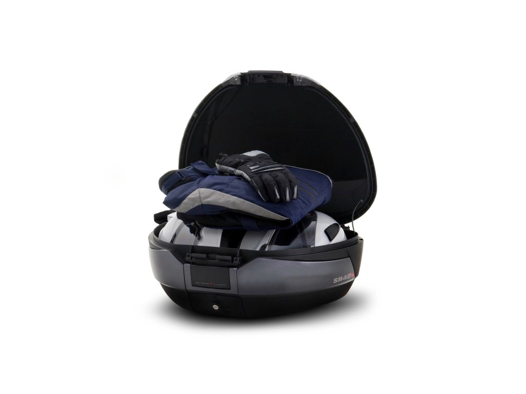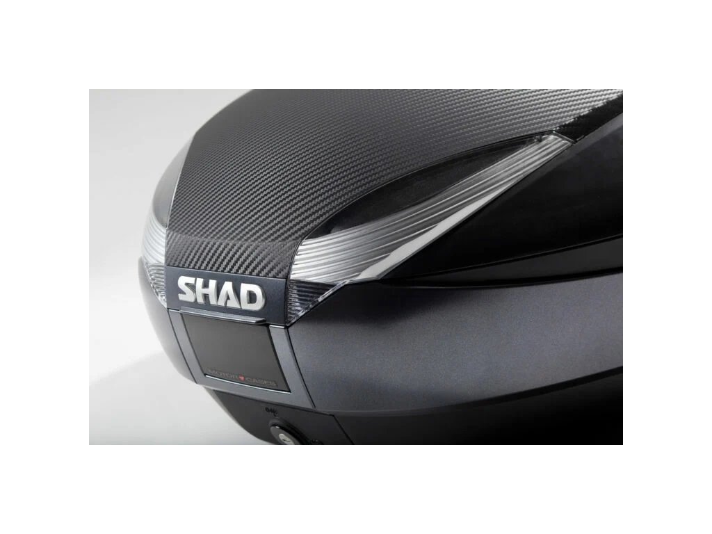 Vrchný kufor SH48 s kapacitou pre 2 helmy Vrchný kufor SH48 je špičkový produkt, ktorý spĺňa všetky požiadavky trhu a ponúka maximálne využitie. Tento kufor má kapacitu pojať 2 XXL helmy, ale zároveň jeho hmotnosť je iba 3,7 kg, čím sa stáva najľahším veľkokapacitným vrchným kufrom na trhu. Konštrukcia tohto kufra zaručuje vysokú tuhosť a odolnosť pri zachovaní minimálnej hmotnosti, čím okrem iného dochádza k redukcii vibrácií podvozku motorky a vy si môžete vychutnávať pohodlnú jazdu. Kufor SH48 ponúka maximálne zabezpečenie vďaka inovatívnemu hermetickému zámku „Smart Lock System“, s automatickou sklopnou rukoväťou a hermetickým zámkom s tromi polohami. Tento systém umožňuje otvoriť a zatvoriť kufor iba jednou rukou bez kľúča. Kľúč použijeme iba ak chceme kufor zamknúť alebo odomknúť alebo sňať či pripevniť k motorke. SH48 ponúka niekoľko variantov ako farebne nakombinovať bočné pásy s vrchným krytom kufra. Je možné si objednať aj karbónový vzhľad veka, ktorý je možné nakombinovať s akoukoľvek farbou motorky. Vrchné kryty je možné ďalej zakúpiť v bielej farbe, metalickej čiernej alebo vzhľad New Titanium či Dark Grey. Je tiež možné objednať si variant bez laku, kedy si farbu krytu môžete sami prispôsobiť podľa vlastného vkusu. Ako voliteľné príslušenstvo je možné dokúpiť dvojitú opierku, vnútornú tašku, vrchný nosič a brzdové svetlo. Opierka (D0RI4800) zaručuje väčšie pohodlie pre spolujazdcov. Vnútorná taška (X0IB00) s vrchným otváraním a vonkajším vreckom je perfektný doplnok, keď je potrebné previezť náklad bezpečne a pohodlne. Je vyrobená z vysoko kvalitných materiálov. Vrchný nosič (D0PS00) zvyšuje kapacitu kufra pri zachovaní rovnakého maximálneho zaťaženia. Má tiež špecifické úchyty pre popruhy na zaistenie a držanie nákladu. Brzdové svetlo (D0B29KL) je úsporné LED svetlo, ktorého montáž je veľmi jednoduchá. Toto svetlo zvyšuje bezpečnosť prevádzky, pretože motorka sa s týmto svetlom stáva oveľa viditeľnejšou zozadu. Rovnako ako všetky vrchné kufre SHAD (okrem TR48/TR37) je aj kufor SH46 dodávaný s platňou a sadou montážnych skrutiek.Dodatočné parametre