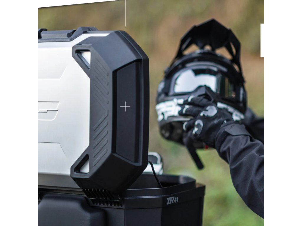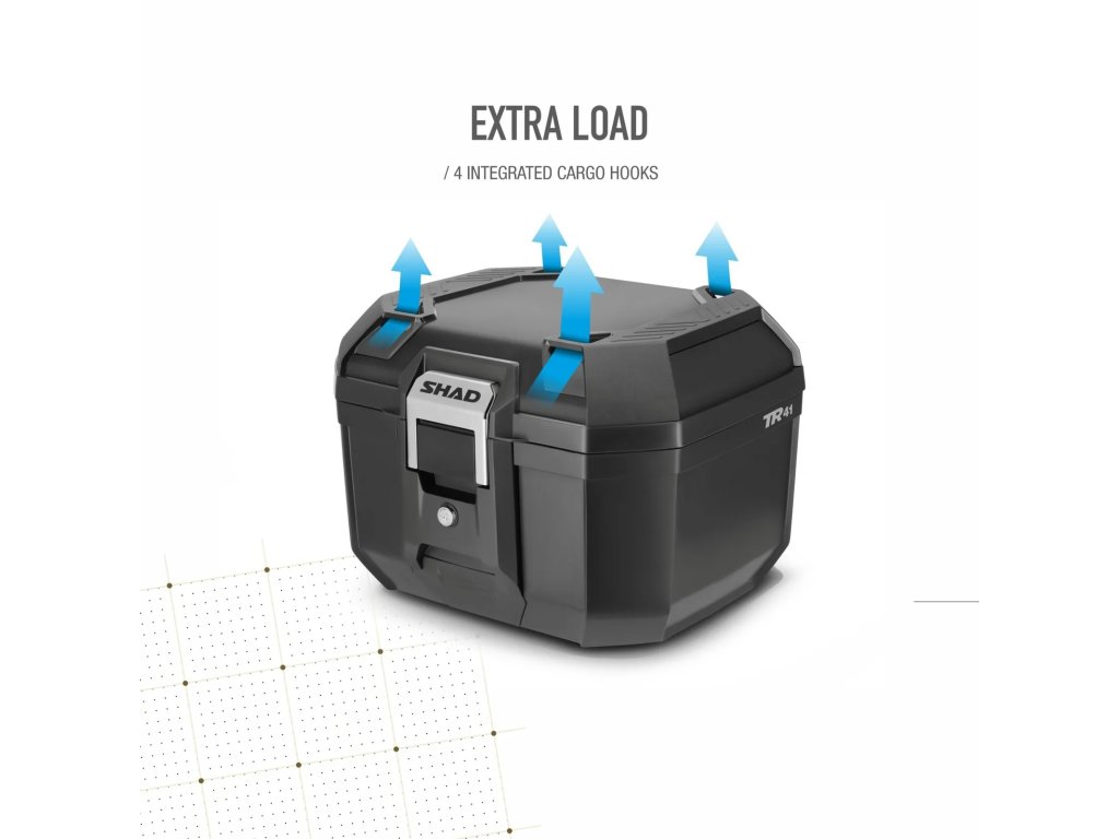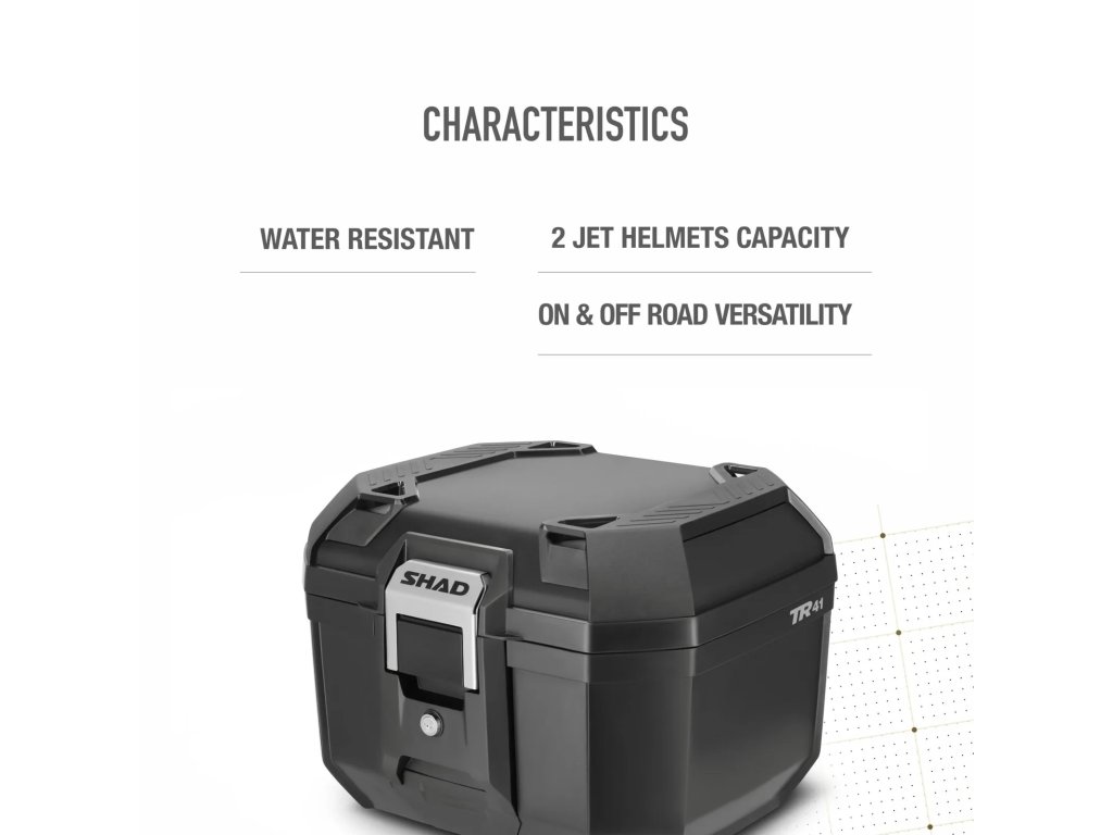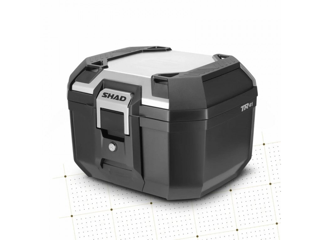 Topcase TERRA TR41 pojme dve otvorené prilby typu JET alebo náklad do 5 kg. Je vyrobený z vystuženého polypropylénu, ktorý zaisťuje vysokú odolnosť pri minimálnej hmotnosti. Plne navrhnutý v Barcelone, má konštrukciu vytvorenú pre maximálnu odolnosť aj v náročných podmienkach. Tesniaci rám chráni obsah proti dažďu a prachu. Hore nájdete háčiky na pripevnenie ďalšieho nákladu a robustný nerezový zámok pre maximálnu bezpečnosť. TR41 je všestranný kufor vhodný na cestné aj terénne použitie. Pojme dve prilby veľkosti M typu JET alebo jednu trailovú prilbu veľkosti XL (norma ECE 22.06) Konštrukcia z vysoko kvalitného vystuženého polypropylénu – maximálna odolnosť pri hmotnosti iba 3,8 kg (4,1 kg s hliníkovým vekom) Horné veko z eloxovaného hliníka Bezpečnosť: zamykací systém z 4 ľahké otváranie, zatváranie, sňatie aj prenášanie kufra počas pár sekúnd Odolný proti vode (ekvivalent IPX5): pogumované tesnenie zaisťuje vodotesnosť Montážna platňa SHAD je súčasťou balenia, k montáži na motocykel dokúpte montážnu sadu TopMaster Možnosť zjednotenia zámkov: Rozmery: 46,5 × 40,8 × 31,5 cm Možnosť prepravy ďalšieho nákladu vďaka 4 pevným horným háčikom Maximálne odporúčané zaťaženie (vnútri aj hore): 5 kg Navrhnuté 100% v Barcelone Voliteľné príslušenstvo: opierka pre spolujazdca (D0RI41) maximálna dvojvrstvová (D0B40KL).Dodatočné parametre